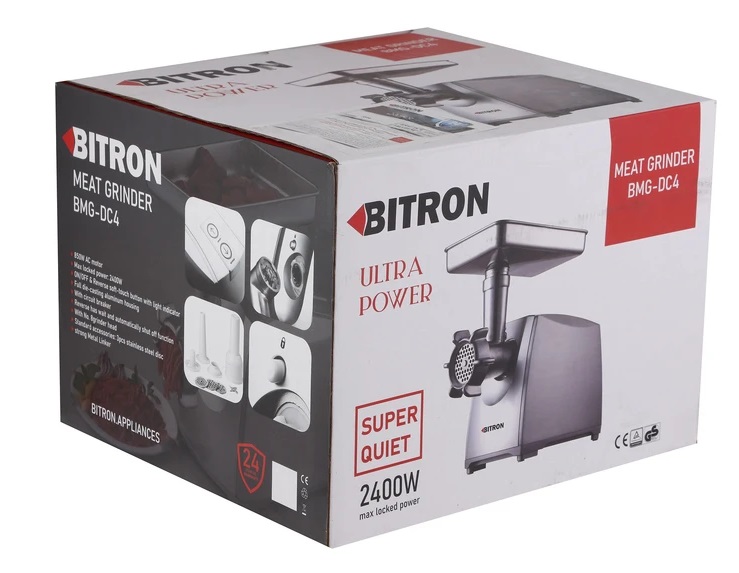 چرخ گوشت بایترون مدل BMG-DC4 با قدرت 2400 وات و برخورداری از چرخ دنده های فلزی بسیار قوی و ظرف فلزی و انواع پنجره ها درسایزهای مختلف و سری لوله ای(سوسیسی) توانایی چرخ کردن انواع گوشت ها چه به صورت گرم و چه به صورت سرد شده را دارد و مشتغات دیگر مثل پیاز وغیره را به راحتی چرخ میکند وبا توجه به سیستم (SUPER QUIET) موجود در آن کمترین صدا را تولید میکند و هنگام کار مصرف کننده را اذیت نمیکند.