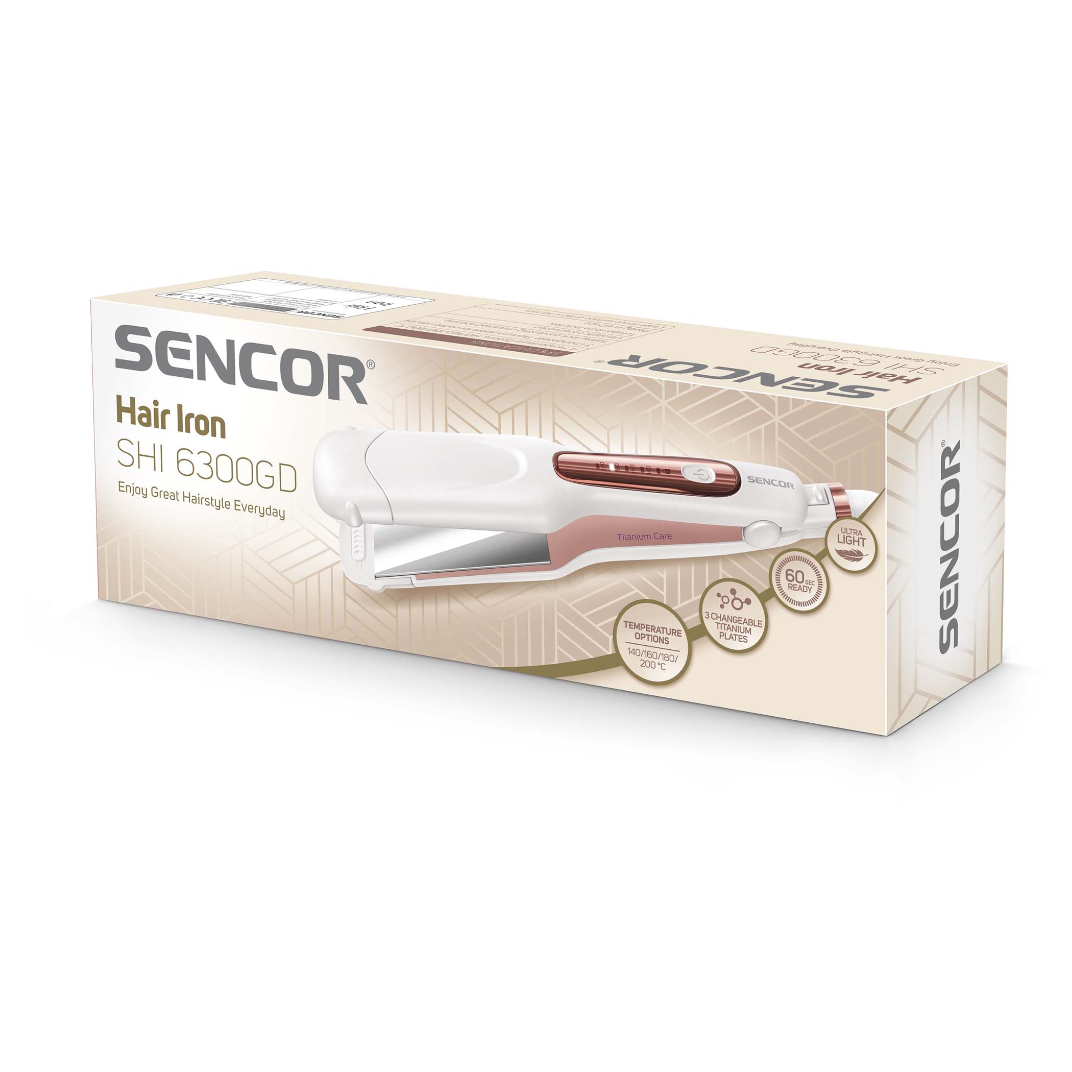 از دیگر مزایایی که اتو مو سنکور مدل SHI 6300GD دارد مساحت صفحه اتو می باشد که 9×4 سانتی متر است و برای اتو کشی انواع مدل مو مناسب است. ابعاد این محصول فوق العاده 3.8×5×26 سانتی متر است و وزن سبکی دارد و به راحتی جابه جا می شود. همانطور که در عکس مشاهده می کنید طراحی بسیار شیکی دارد و توجه هر خانم خوش سلیقه ای را به خود جذب می کند. در ادامه این متن مشخصات فنی این دستگاه را با هم بررسی می کنیم پس با ما همراه باشید.اتو مو چند کاره سنکور مدل 6300GD دارای سه سطح قابل تعویض می باشد که به دو صورت موها را صاف و کرپ می کند. سطوح اتو به راحتی قابل تعویض هستند و عملکردی بالاتر از حد متوسط را در رسیدن به نتیجه مورد انتظار انجام می دهند. شما با استفاده از این سه سطوح می توانید موهایتان را کاملا صاف، کمی موج دار و بسیار موج دار کنید و به آنها حالت بدهید. همانطور که در بالا ذکر کردیم صفحات این مدل از اتوی مو سنکور تیتانیومی هستند. تیتانیوم مزایای بسیار زیادی دارد و صفحاتی که از این جنس هستند در بین بهترین صفحات حالت دهنده مو قرار دارند. صفحات تیتانیومی خیلی سریع گرم می شوند و مو به راحتی بین آن ها می لغزد. انرژی ساکن مو را با استفاده از فناوری یون حذف می کنند و به مو خاصیت ارتجاعی، درخشندگی و مراقبت بهتری می بخشند. این نوع صفحات دوام بسیار بالایی دارند و در بین انواع صفحات اتو مو از دوام بیشتری برخوردار هستند.