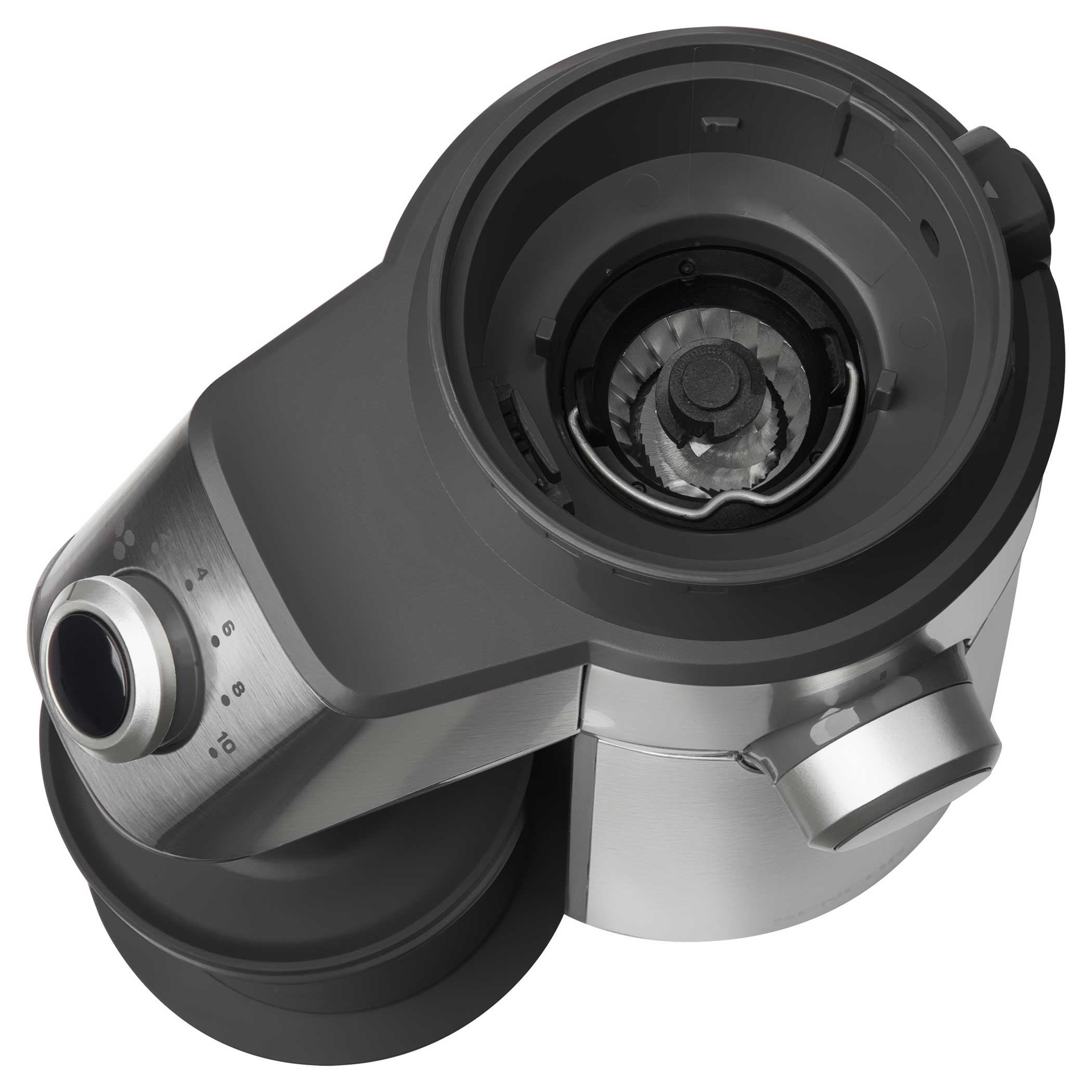 بدنه استیل این آسیاب با کیفیت بالا ساخته شده و دارای دو مخزن مجزا در قسمتهای بالا و پایین است. مخزن شفاف برای دانههای قهوه ظرفیت 350 گرم را دارد و به راحتی قابل جدا شدن برای شستشو میباشد.