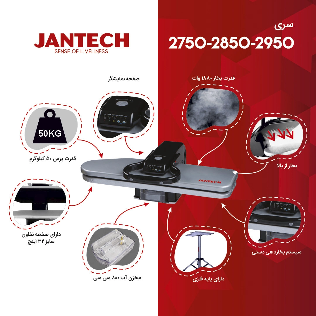 اتو پرس جانتک مدل 2850با قدرت بخار 1880 وات و خروجی بخار 90 گرم در دقیقه، قادر است بخار قوی و مداومی تولید کند که به راحتی چین و چروکهای عمیق پارچه را از بین ببرد. با آمادگی بخار در مدت زمان تنها 3 دقیقه، این اتوپرس به سرعت آماده به کار میشود و شما میتوانید بدون اتلاف وقت به اتوکشی بپردازید. سیستم بخار از بالا نیز به توزیع یکنواخت بخار بر روی سطح پارچه کمک میکند، که نتیجهای بهتر و حرفهایتر به ارمغان میآورد.یکی از ویژگیهای مهم این اتوپرس، جنس کفه فلزی آن است که باعث میشود حرارت به خوبی به پارچه منتقل شود و از دوام و ماندگاری بالایی برخوردار باشد. اندازه طول صفحه 32 اینچی این دستگاه، فضای مناسبی را برای اتوکشی پارچههای بزرگ و لباسهای بلند فراهم میکند.