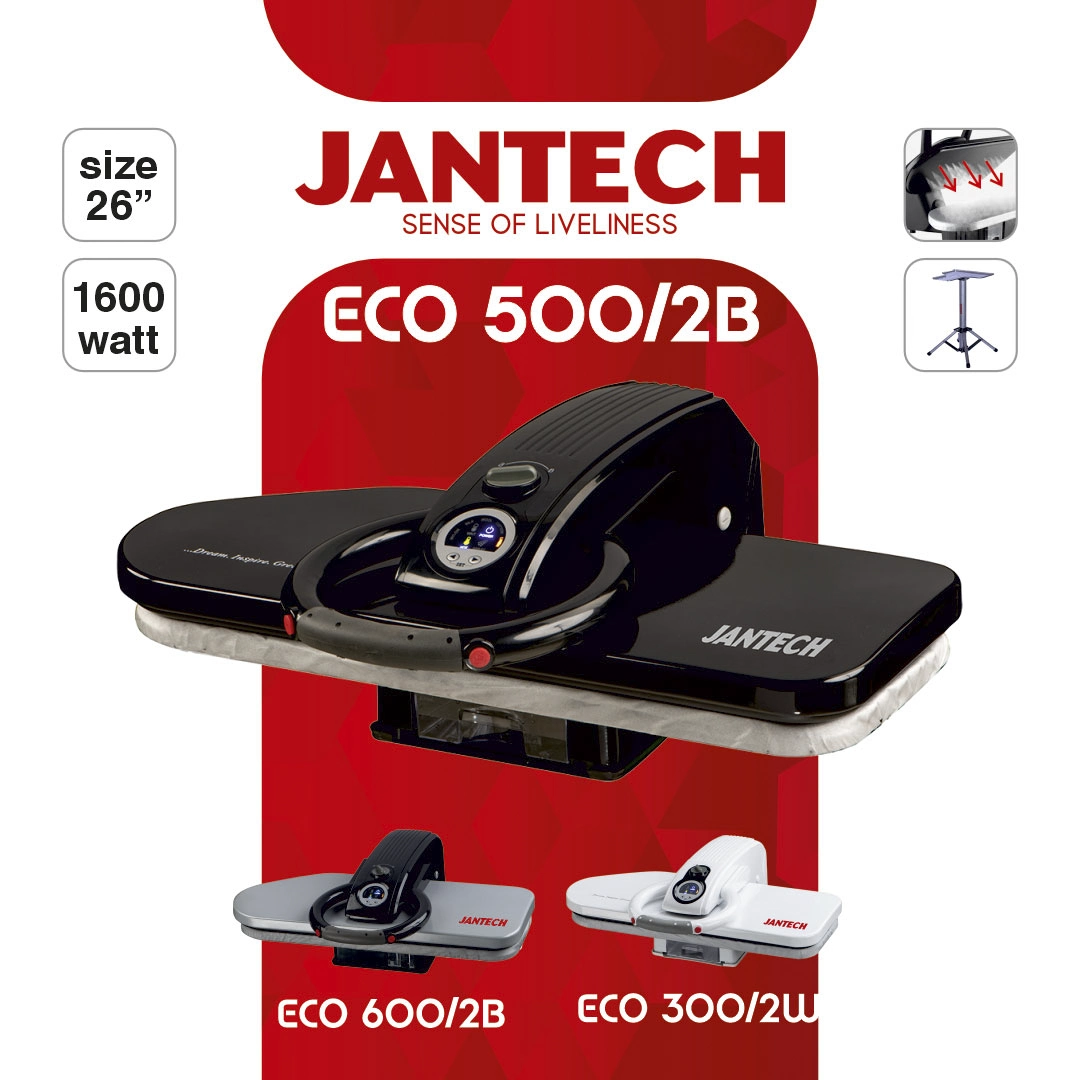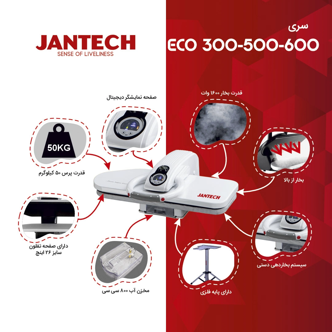 اتو پرس جانتک مدل ECO500با شاسی بخار و نمایشگر دیجیتال، پیشرفتهترین امکانات را در اختیار کاربران قرار میدهد. این دستگاه با رنگ بدنه نقرهای و دسته و پایه مشکی، ظاهری شیکترین و مدرنترین دارد که به دکوراسیون منزل شما جلوهای خاص میبخشد. مدلهای ECO500 و ECO600 نیز دارای مشخصات فنی یکسانی با مدل ECO300 هستند و تنها تفاوت آنها در رنگ دستگاه است.
