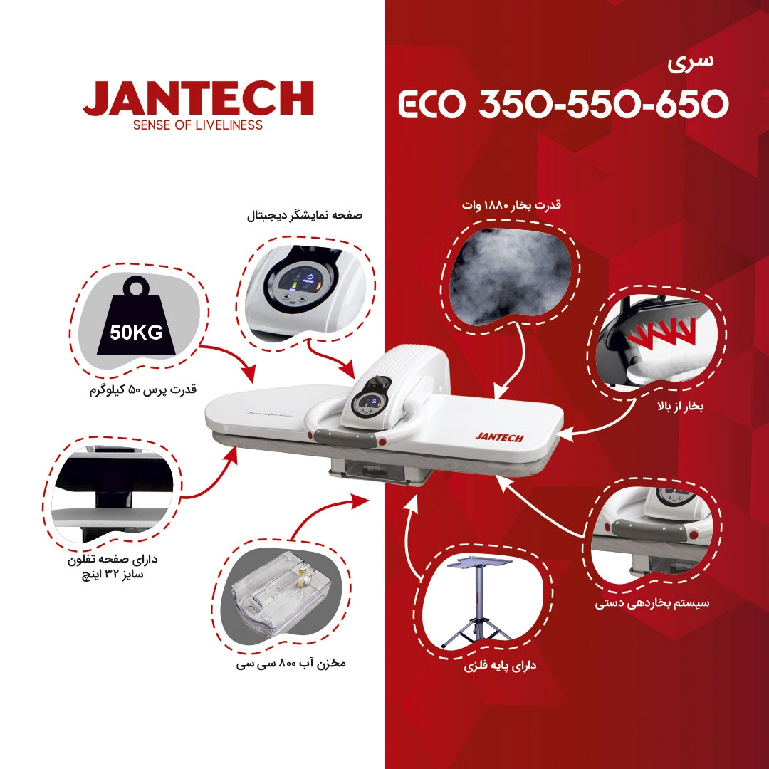 اتو پرس جانتک مدل ECO550با شاسی بخار و نمایشگر دیجیتال، کاربری ساده و کارآمدی را فراهم میکند. رنگ بدنه، دسته و پایه مشکی ظاهری شیک و مدرن به این دستگاه بخشیده است که با هر دکوراسیونی هماهنگی دارد. مدلهای ECO550 و ECO650 نیز از لحاظ فنی مشابه مدل ECO350 هستند و تنها تفاوت آنها در رنگ دستگاه استجنس بدنه این اتو پرس بسیار مقاوم است و در برابر تغییر رنگ، فشار مکانیکی و خط و خش بهترین عملکرد را از خود نشان میدهد. قدرت پرس این اتو 50 کیلوگرم است و میتواند پارچههای ضخیم و نازک را به صورت حرفهای اتو کشی کند. با وجود مناسب بودن قیمت اتو پرس جانتک مدل ECO550 اما همچنان این محصول دارای ویژگیهای بسیار خوبی است و میتواند نیازهای شما را به یک اتوی زیبا در منزل برطرف کند. برای خرید بدون واسطه این اتو، میتوانید از طریق سایت سفارش خودتان را ثبت کنید.