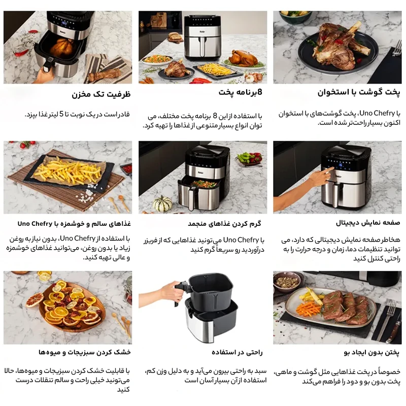 تجربهی سرخ کردن سالم و خوشمزه را با سرخ کن بدون روغن فکر مدل Uno Chefry تجربه کنید! این دستگاه با تکنولوژی پیشرفته، خوراکیها را ترد و لذیذ میکند بدون نیاز به روغن اضافه. ایدهآل برای یک سبک زندگی سالم و آسان، با طراحی شیک و کاربری ساده. همین حالا خرید کنید و طعم سلامت را بچشید!