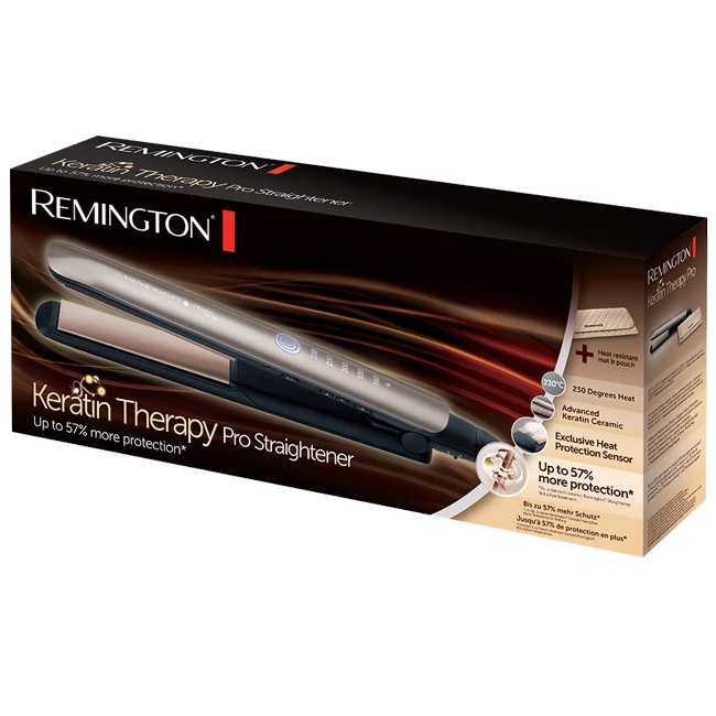 آیا چیزی جذاب تر از موهای فوق العاده براق، صاف یا حالت دار زیبا وجود دارد؟ در کنار قابلیت حالت دهندگی و صاف کردن آیا اتوی مویی را می شناسید که نهایت محافظت و تقویت موها را فراهم کند. با اتو مو رمینگتون مدل S8590 در حالی که مدل موی دلخواهتان را ایجاد می کنید، موهایتان را محافظت و تقویت کنید.این اتو مو دارای صفحات با روکش سرامیکی تقویت شده و نرم کننده های میکرو کراتین تزریق شده است که در طول حالت دادن به موها منتقل می شوند. این یک اتوی مو ساده نیست، بلکه صاف کننده حرفه ای با قابلیت کراتین تراپی بوده و در حالی که موهایتان را صاف می کنید و یا حالت می دهید تقویت هم می شوند. بنابراین استفاده از این اتو مو نه تنها برای موهایتان ضرر ندارد، بلکه به سلامت موهای شما کمک موثری هم خواهد کرد.