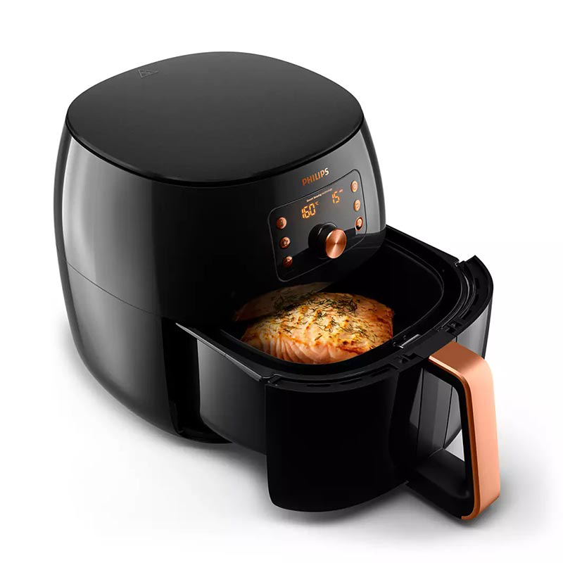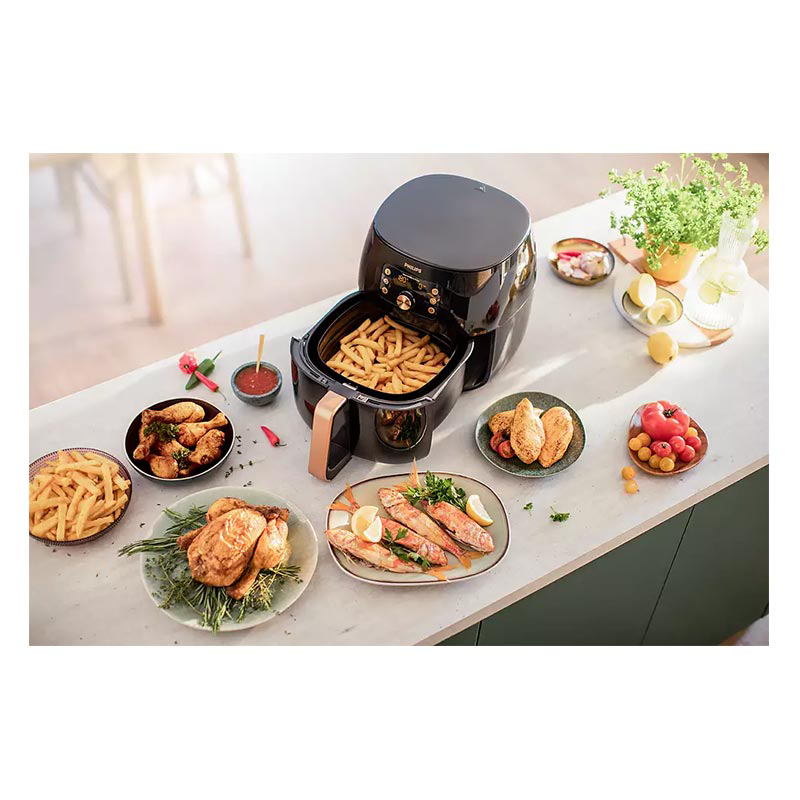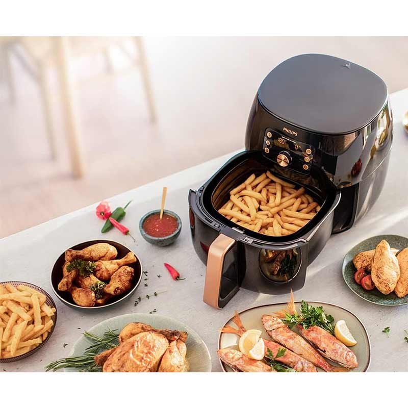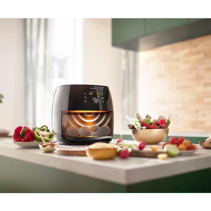 سرخ کن بدون روغن فیلیپس مدل HD9867 یکی از محصولات برجسته و باکیفیت در دنیای لوازم خانگی به شمار میرود. این دستگاه با توجه به ویژگیهای منحصربهفردش، نه تنها امکان تهیه غذاهای خوشمزه و سالم را فراهم میکند بلکه به طرز چشمگیری در صرفهجویی زمان و انرژی هم کمک میکند. یکی از ویژگیهای بارز سرخ کن فیلیپس HD9867، ظرفیت XXL آن است که به کاربر این امکان را میدهد تا با استفاده از سبد بزرگ ۷.۳ لیتری، غذاهای بزرگی مثل یک مرغ کامل یا کباب ۱.۴ کیلوگرمی را به راحتی تهیه کنید. این ظرفیت به اندازهای است که میتوان تا شش وعده غذا را به طور همزمان و بدون هیچ گونه زحمتی آماده کرد. چنین ظرفیتی به کاربران این امکان را میدهد تا در مجالس و مهمانیها، تجربهای لذیذ و دلپذیر را برای خانواده و دوستان خود رقم بزنند.این سرخ کن به پنج برنامه پخت و پز از پیش تعیین شده مجهز است که با انتخاب هر یک از آنها، میتوان انواع غذاها نظیر سیبزمینی سرخکرده، استیک، مرغ، ماهی، میگو، پیتزا، همبرگر، کیک و حتی سبزیجات مختلف را در عرض چند دقیقه آماده کرد. طراحی کاربرپسند این دستگاه یک لمس کافی برای انتخاب برنامه مورد نظر دارد و فرایند آشپزی را به طرز چشمگیری تسهیل میکند.سرخ کن بدون روغن فیلیپس مدل HD9867 به گونهای طراحی شده است که در مقایسه با فرهای معمولی، تا ۷۰ درصد در مصرف انرژی صرفهجویی کرده و زمان پخت غذا را تا ۵۰ درصد کاهش دهد. این ویژگی به کاربران کمک میکند تا نه تنها در وقت بلکه در هزینههای انرژی خود هم صرفهجویی کنند.سرخ کن مذکور به کاربران این امکان را میدهد که برنامههای پخت دلخواه خود را ذخیرهسازی کنند، بهطوریکه تنها با یک فشردن دکمه میتوانند غذای مورد علاقهشان را با دما و زمان ایدهآل تهیه کنند. این قابلیت نهتنها به تسهیل فرآیند پخت کمک میکند، بلکه نهایت راحتی را برای کاربران فراهم میآورد تا بتوانند به سادگی از یک میان وعده گرم یا یک غذای اصلی لذیذ بهرهمند شوند. فناوری Rapid Air یکی از ویژگیهای کلیدی سرخ کن فیلیپس HD9867 است که به منظور جریان هوای سریعتر و پخت بهتر غذاها طراحی شده است. با استفاده از این فناوری، هوا درون محفظه دستگاه به طور یکنواخت و با سرعتی هفت برابر سریعتر از دستگاههای معمولی گردش میکند. این عملکرد موجب میشود تا غذاهایی که در این سرخ کن تهیه میشوند، ترد و خوشمزه باقی بمانند و تا ۹۰ درصد چربی کمتری نسبت به روشهای سنتی داشته باشند.